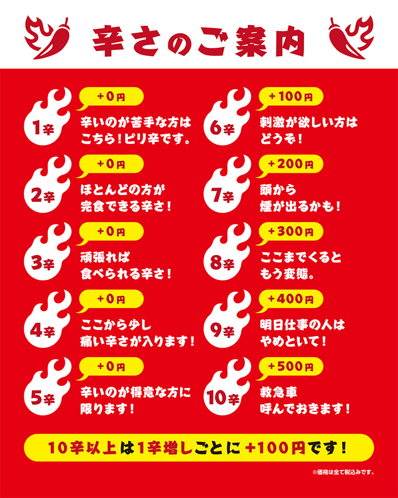 辛いラーメン 辛くないラーメン サイドメニュー お子様メニュー おつまみ 飲み物 辛いラーメン 辛さのご案内 帝王ラーメン 当店一番人気の勝浦式担々麵! 帝王味噌ラーメン 勝浦式タンタンメンの味噌バージョン! 胡麻味噌担々麵 濃厚旨辛クリーミーな担々麵! まぜそば 〆の追い飯付き 辛くないラーメン 鶏そば 濃厚な鶏白湯とサバ節のハーモニー♪ 竹岡式醤油ラーメン 内房のソウルフード! 味噌ラーメン 濃厚味噌ラーメン サイドメニュー チャーハン 餃子 チャーシュー丼 ミニネギ丼 たまごかけご飯 ライス チャーハンセット 単品で注文するより190円お得! ネギ丼セット 単品で注文するより190円お得! ライスセット 単品で注文するより50円お得! あんにんセット 単品で注文するより100円お得! お子様メニュー お子様ラーメンセット ご注文は小学校低学年ぐらいまで お子様チャーハンセット ご注文は小学校低学年ぐらいまで お子様餃子セット ご注文は小学校低学年ぐらいまで おつまみ おつまみ盛り合わせ ニンニク豚バラ巻き 唐揚げ ガーリックポテト 特製キムチ 枝豆 おつまみメンマ 杏仁豆腐 ドリンクメニュー ハイボール 生ビール 中ジョッキ 梅割り アサヒドライゼロ ノンアルコールビール サワー 帝王名物!割りもの入れ放題! 焼酎(芋・麦・鏡月) ロック・水割り・ウーロン割り ソフトドリンク PDFを見る